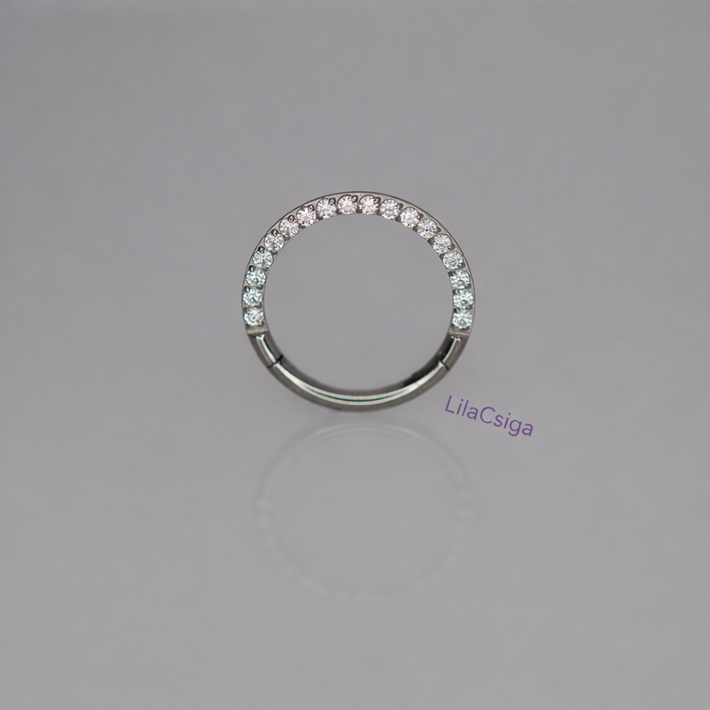 ⚠️ Fontos: A zsanéros karika kizárólag gyógyult piercingekhez használható. Bár külsőleg simának tűnik, a zsanér illesztése nem simul teljesen a szár belsejébe, így a keletkező mikroszkopikus lépcső vagy rés irritálhatja a gyógyuló szöveteket. Ezért friss szúrásba nem javasolt.