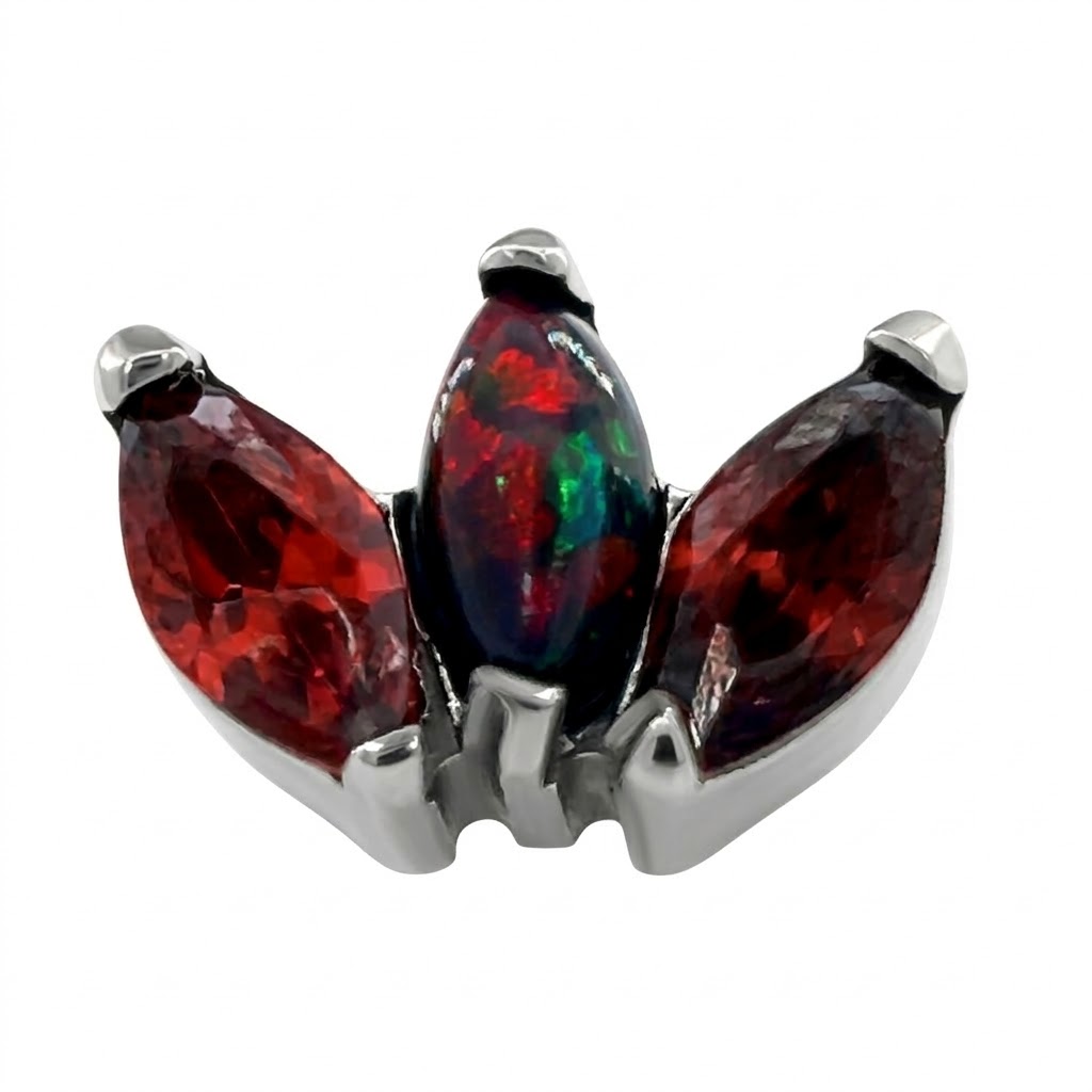 A „Lupercalia” egy drámai, mégis kifinomult testékszer felsőrész, amely három darab mélyvörös, mandula csiszolású (marquise) cirkónia követ foglal elegáns legyező formába. A középső kő függőleges elhelyezése határozott karaktert ad a kétoldalt enyhén ívelő köveknek, melyeket tükörsima, polírozott titánium foglalatok rögzítenek.