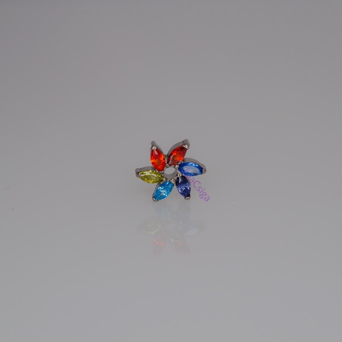 A „Pride Catherine Wheel” egy látványos, kerék formájú testékszer felsőrész, amely hat darab különböző színű, mandula csiszolású (marquise) cirkónia követ foglal különleges alakzatba. A szivárvány árnyalataiban tündöklő köveket polírozott titánium foglalatok rögzítik, melyek tartós és kényelmes viseletet biztosítanak.